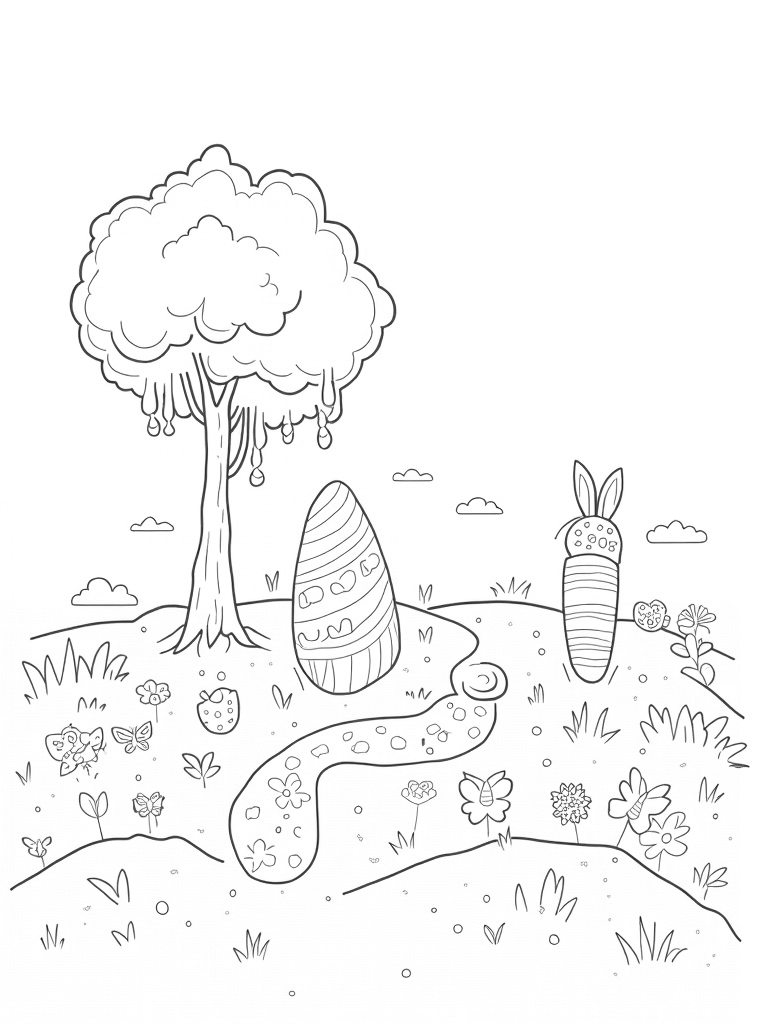This scene is all about a magical garden where giant, decorated eggs peek out from the ground like cheerful flowers. Right in the middle, there's a spiral path made of colorful pebbles that wraps around a tall, carrot-shaped tree. Its branches are draped with pretty pastel ribbons, making it look even more festive. Nearby, fluffy clouds shaped like bunnies float by, their long ears playfully extending outward.