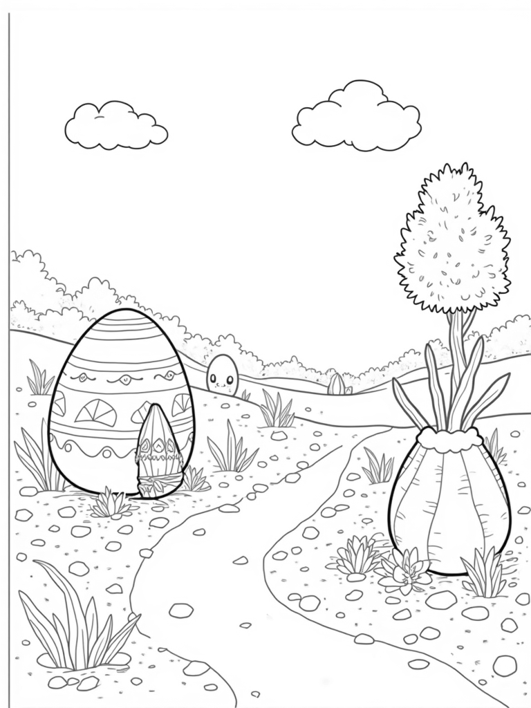 Right in the heart of this garden, you'll spot oversized eggs sprouting up like colorful flowers. Each egg is uniquely decorated with intricate patterns that just beg for your favorite colors! In the center, there’s a hollowed-out carrot that doubles as a cozy nook, complete with tiny lanterns that light up the scene.