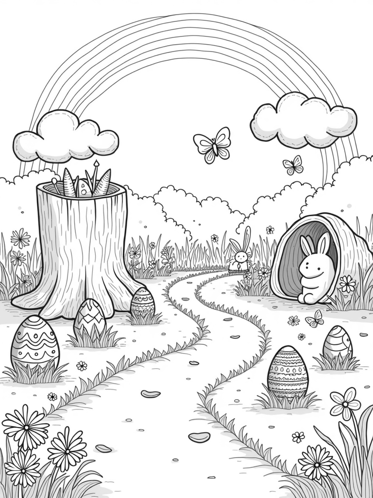 Imagine a magical garden filled with oversized, beautifully decorated eggs tucked among vibrant flowers. A colorful jellybean path winds its way through the scene, leading to a charming hollow tree stump. This stump is adorned with intricate carvings of rabbits and carrots, adding a whimsical touch to the landscape. Above, fluffy clouds shaped like bunny ears float in the bright blue sky, while a cheerful rainbow arches gracefully in the background.