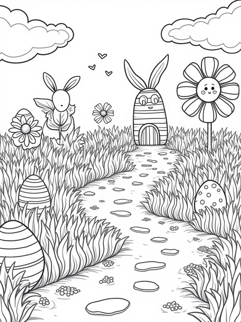 Easter Bunny's Colorful Garden with Giant Eggs and Bouncing Bunnies Coloring Page