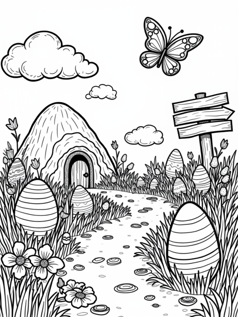 In this delightful scene, you'll find a garden bursting with oversized, brightly patterned Easter eggs nestled among vibrant flowers. Right in the middle, a gentle hill rises up, home to a cozy bunny burrow with a tiny door and window. It's like a little home for our bunny friend!