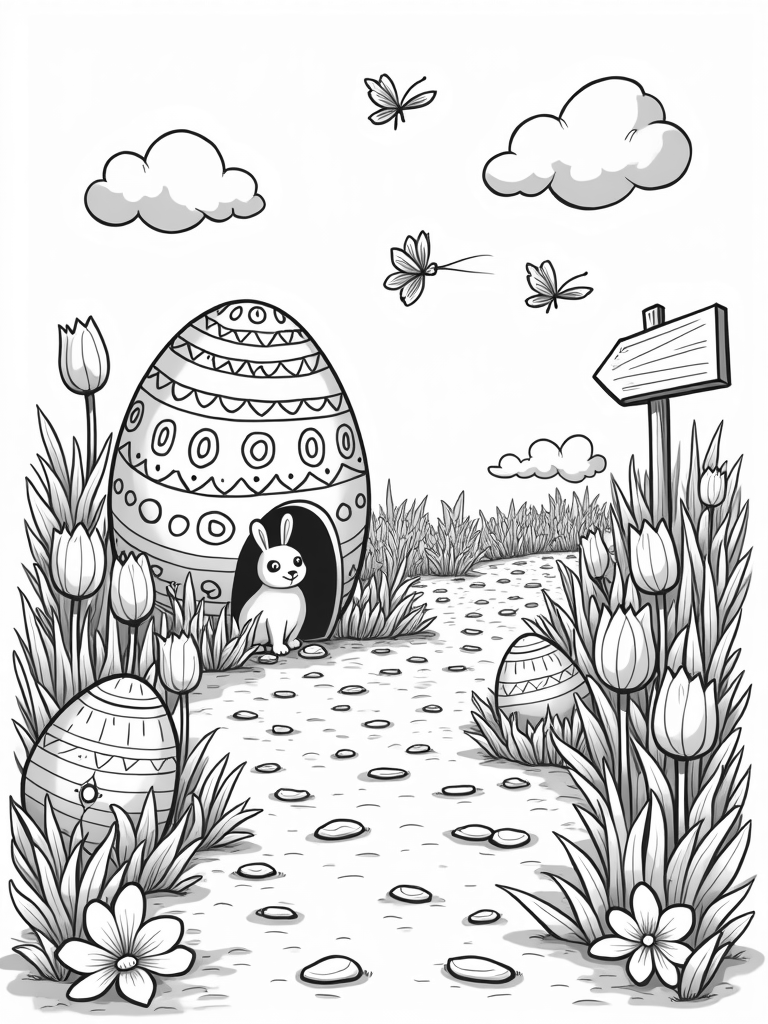 You’ll find a magical garden bursting with oversized, colorful eggs nestled among tall tulips and daisies. Right in the center, there's a giant, beautifully patterned Easter egg that serves as a cozy home for a rabbit. A winding path made of rainbow pebbles leads right to it, making it feel like a real fairy tale!