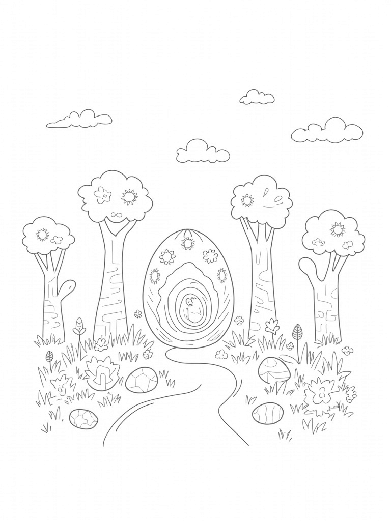 Above, fluffy clouds float by, each one adorned with pretty patterns that you can color in however you like. A gentle stream flows nearby, reflecting all the bright colors of the eggs, making this garden a true feast for the eyes. Grab your crayons and let your creativity run wild!