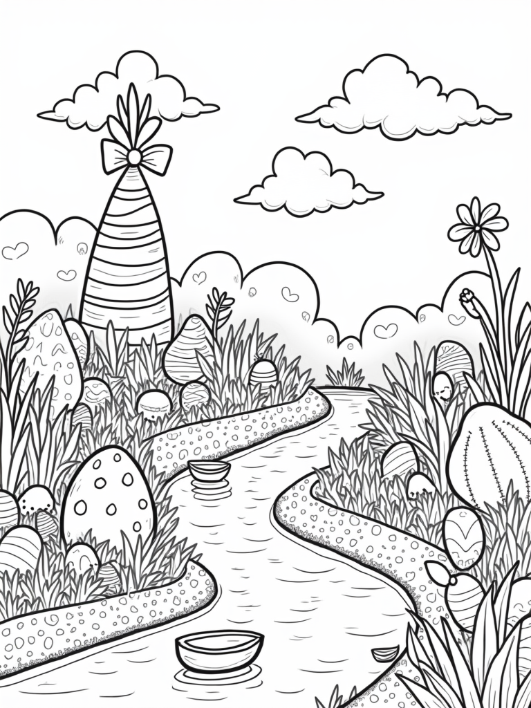 Picture a garden straight out of a dream, where oversized, decorated Easter eggs peek out from behind vibrant flowers. In the center stands a joyful spiral-shaped carrot tower that looks almost like a candy! At the very top, there's a playful bunny silhouette, adding a fun touch to this cheerful scene. A winding path made of colorful jellybeans leads to a gentle stream, where cute egg-shaped boats float along, bobbing up and down like little party guests.