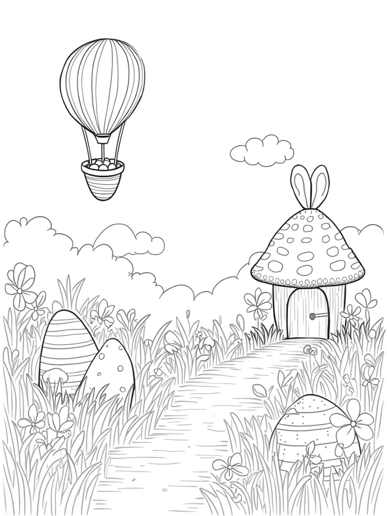 Check out this free, printable coloring page featuring a whimsical Easter meadow. With vibrant flowers, oversized Easter eggs, and a carrot-shaped hot air balloon, it's perfect for kids who love to color and have fun!
