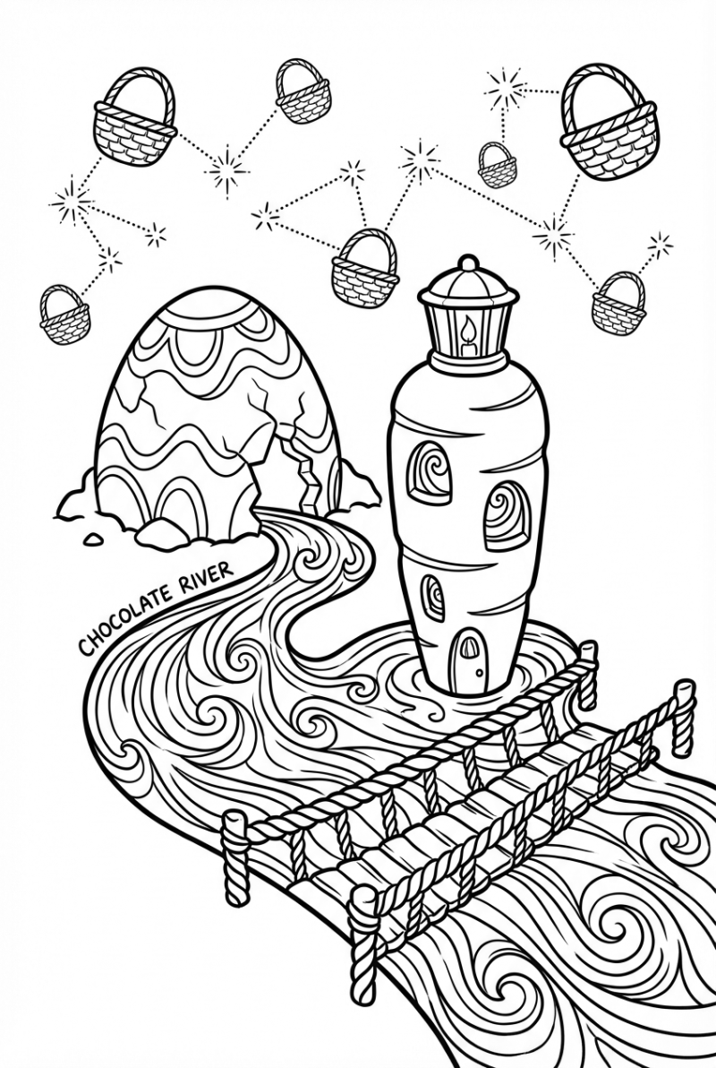 Take a look at this quirky scene: a giant painted egg is cracked open like a canyon, and a smooth river of pastel chocolate spills out, winding its way across the page. Right in the middle, a carrot lighthouse stands tall, lighting up the chocolate flow. A braided twine bridge stretches over the river, inviting you to imagine tiny critters crossing it. Above it all, a sky dotted with floating basket constellations adds a dreamy, magical touch.