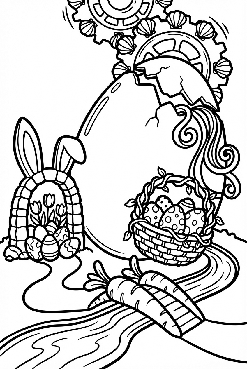 Look at that towering egg that looks like a little hill – its shell is cracked open and pastel ribbons spill out like confetti. Around the base a river of melted chocolate winds its way, curling into a bright carrot‑colored bridge. A floating vine basket hovers nearby, packed with glittery speckled eggs, and a stone arch shaped like a rabbit’s ear frames a garden full of tulip‑shaped eggs. Up above, a gear made of pastel shells turns slowly, adding a whimsical mechanical touch.