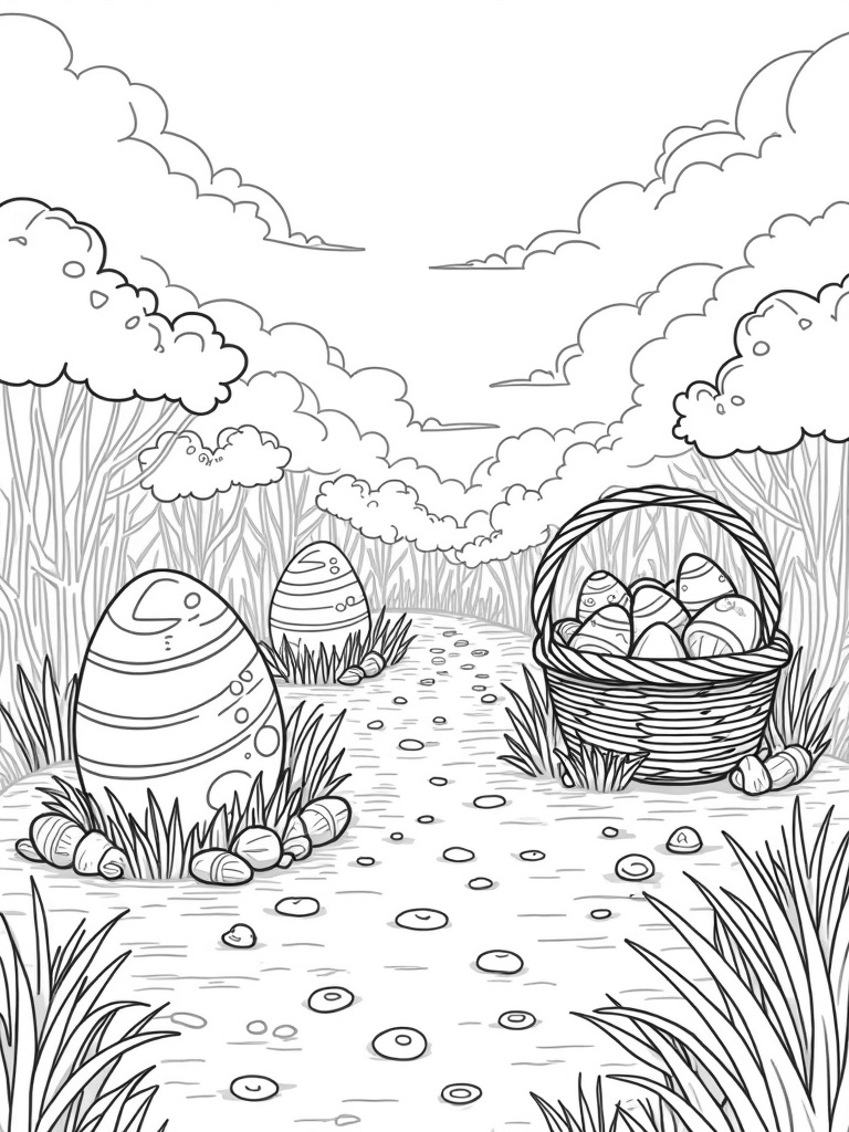 Imagine a garden where giant, colorful eggs pop up from the ground like flowers! Each egg is decorated in fun patterns, making them look like they belong in a fairy tale. Nearby, a winding path made of pastel-colored pebbles leads to a huge wicker basket that’s overflowing with smaller eggs, all waiting to be colored in. The trees in the background are candy-colored, stretching up toward a sky filled with fluffy, bunny-shaped clouds. Scattered throughout the scene, you’ll find quirky carrots hiding among the foliage, each with its own unique design.