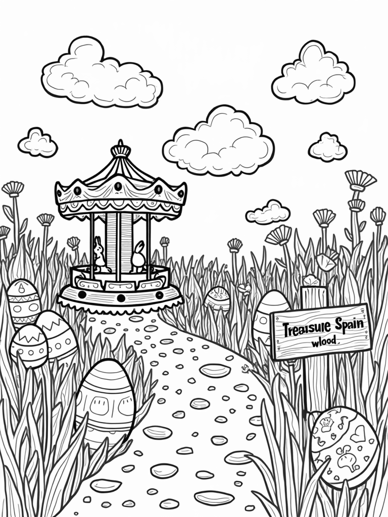 Check out this free, printable coloring page featuring a whimsical garden with giant eggs and a carrot carousel, perfect for celebrating Easter. Let your creativity soar as you color in this fun scene!