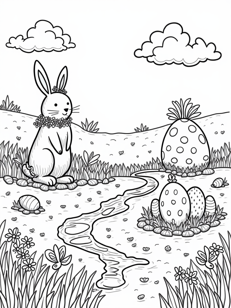 As you color in the scene, take a look at the winding path made of chocolate pebbles leading to a cute fountain shaped like a carrot. Doesn’t that sound delicious? It adds a fun twist to the garden, and you can imagine all the magic happening around it. Fluffy clouds float above, shaped like Easter symbols, making it a perfect place for your imagination to run wild.