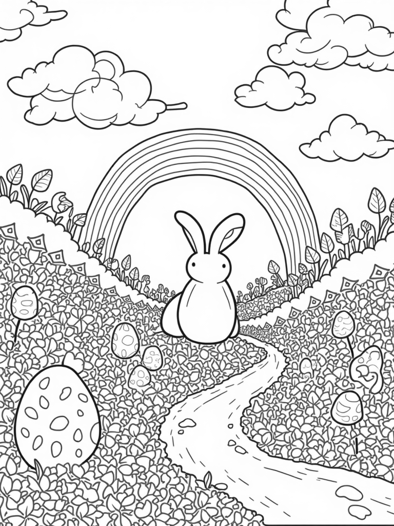 This coloring page is full of fun! At the center, you'll find a giant bunny with floppy ears, sitting proudly on a grassy hill. He's surrounded by massive, pastel-colored eggs tucked among bright flowers that pop with color. It’s a garden that looks like it came straight out of a daydream!