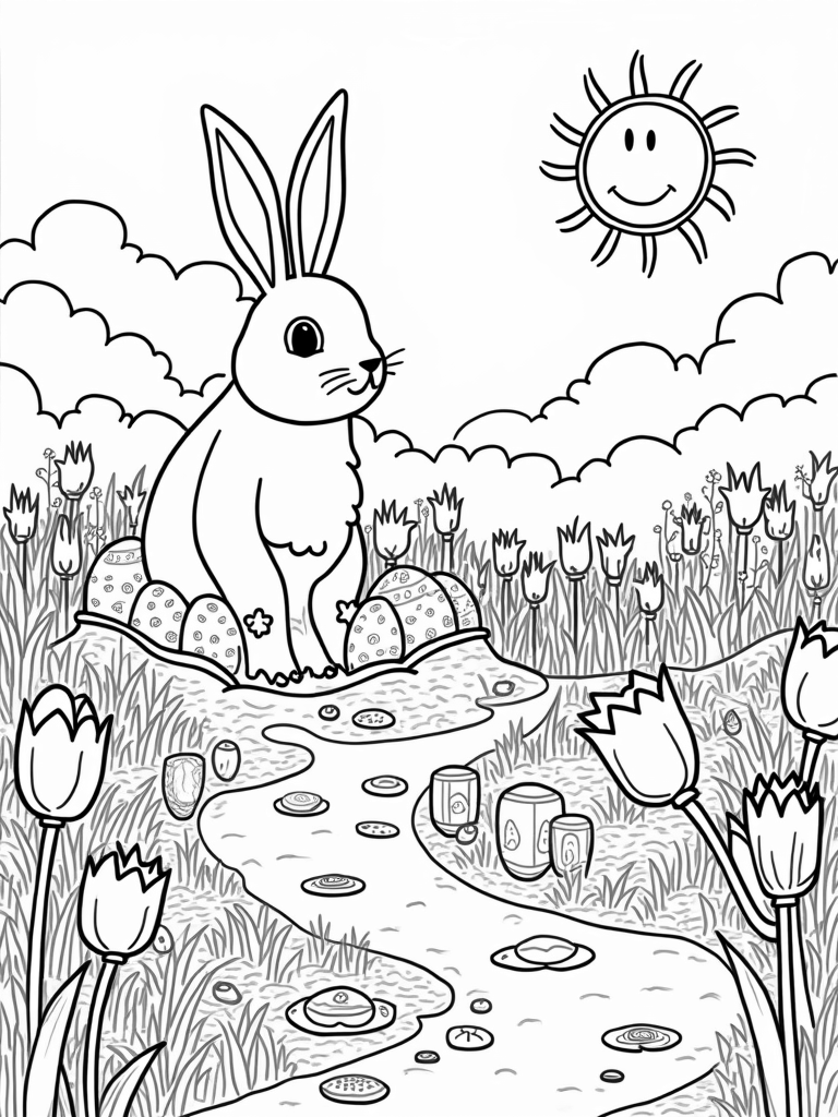 Giant Bunny in a Garden of Decorated Eggs Coloring Page