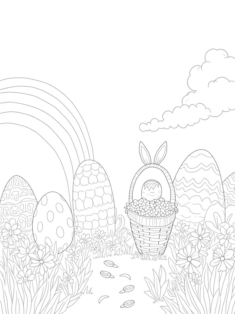 Look closely, and you’ll see tiny bunny footprints leading away into a patch of tall grass. It’s like a little bunny has just hopped by, leaving a trail of fun behind. And don’t forget to check out the fluffy clouds above, shaped just like eggs, while a cheerful rainbow arches across the sky, adding to the charm of this enchanting garden.