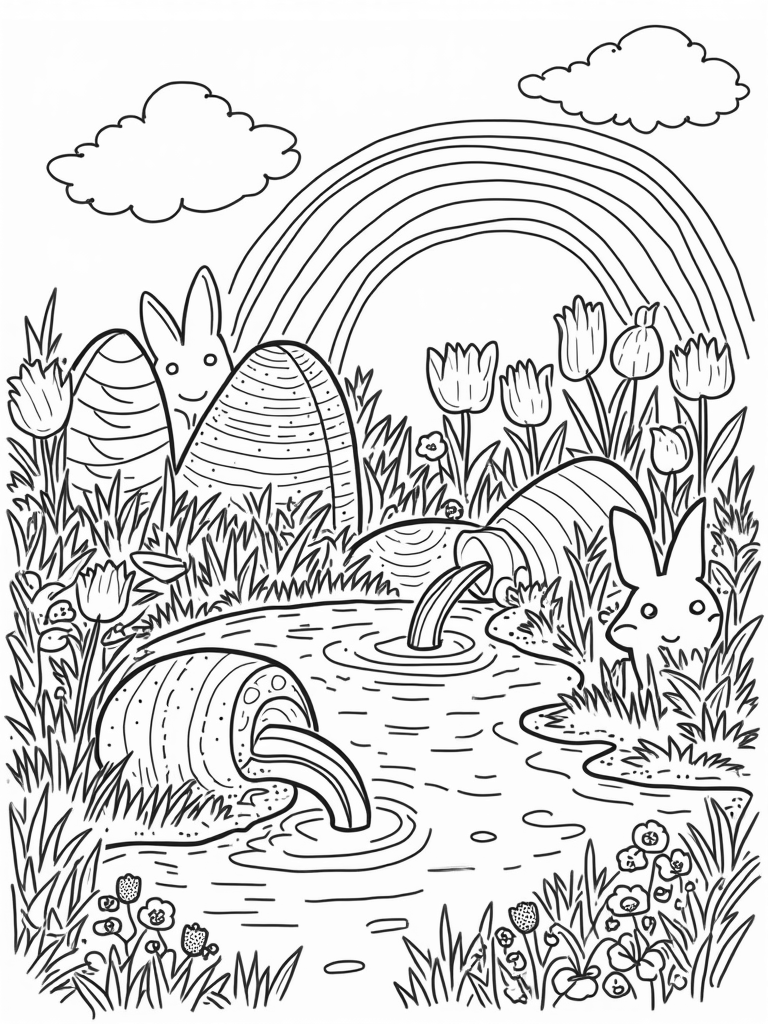 Next to the fountain, there’s a patch of grass where a spiraling bunny burrow sits, covered in cool patterns. Can you picture a fluffy bunny popping in and out of that burrow? It's so inviting! And don't forget to look up at the fluffy clouds shaped like playful bunnies, just drifting by while a lovely rainbow arches across the sky, landing near a bunch of blooming tulips.