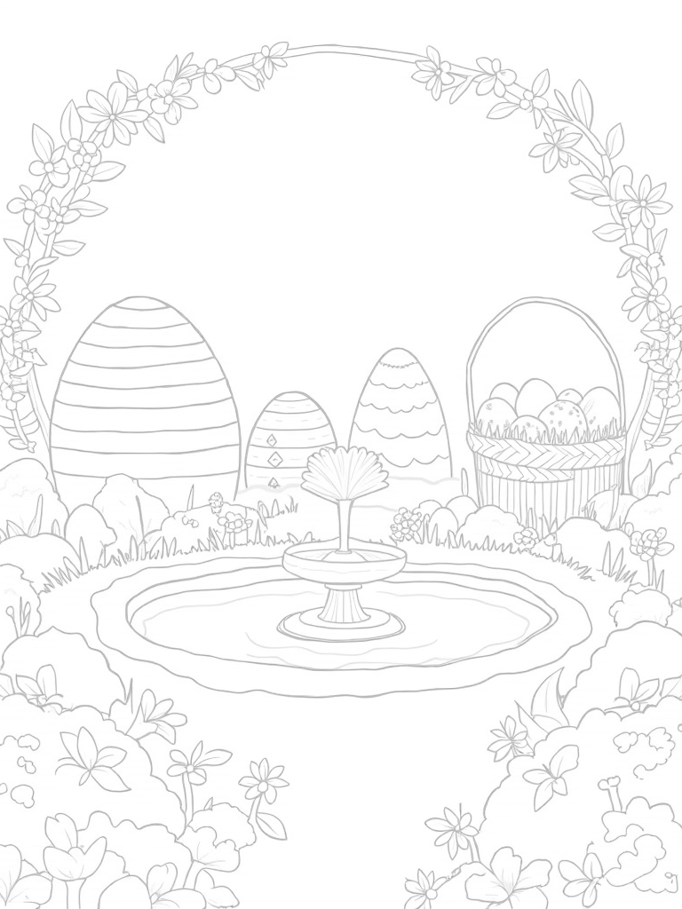 There’s a winding path made of pastel-colored stones that leads to a towering basket, filled to the brim with colorful eggs. It’s the perfect spot for a little one to let their imagination run wild while coloring. And don’t forget the playful arch of blooming vines framing the scene, adding even more charm to this delightful garden!