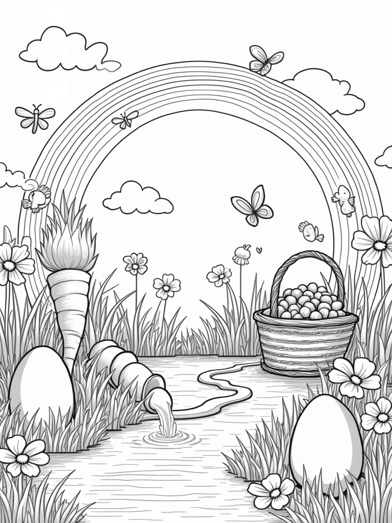 Check out this free, printable coloring page featuring a whimsical garden filled with giant eggs, a carrot-shaped fountain, and playful butterflies. Perfect for Easter Bunny fun, your kids will love bringing this scene to life with their favorite colors!
