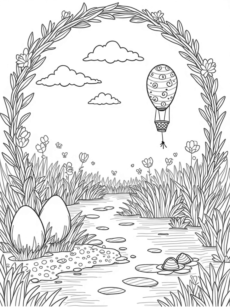 As you color, don’t miss the winding path made of pastel pebbles that leads to a sparkling pond. The lily pads are shaped like Easter baskets, adding a delightful twist to the scene. Look up, and you’ll see fluffy clouds that resemble popular springtime treats, making this garden feel even more magical.