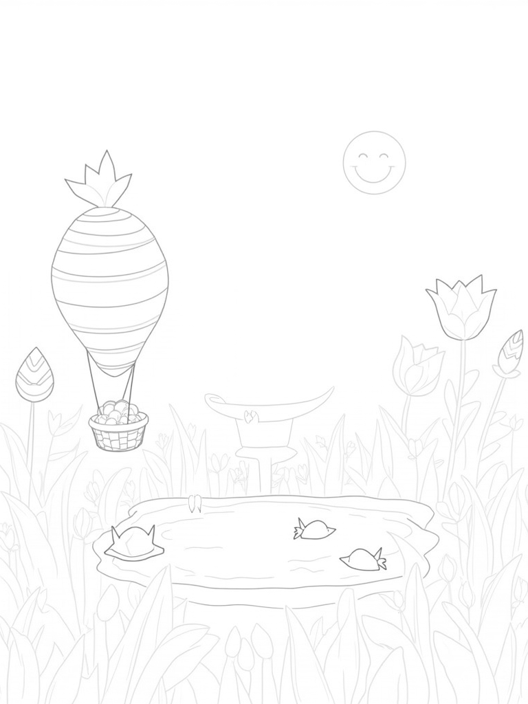 In this delightful scene, you’ll find a meadow filled with oversized, colorful eggs hidden among tall, swaying grass. Right in the center, there's a giant hot air balloon shaped like a carrot, floating gently above. Its basket is overflowing with pastel candies, just waiting to be colored in!
