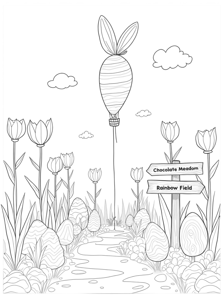 In this delightful garden, oversized, patterned eggs peek out from behind tall, spiraling tulips. Right in the middle, there's a giant hot air balloon shaped like a carrot, floating high above the scene. It's tied down with colorful ribbons that dance in the breeze. Below, a winding pebble path invites you to stroll toward a charming wooden signpost with fun arrows pointing to 'Chocolate Meadow' and 'Rainbow Field'.