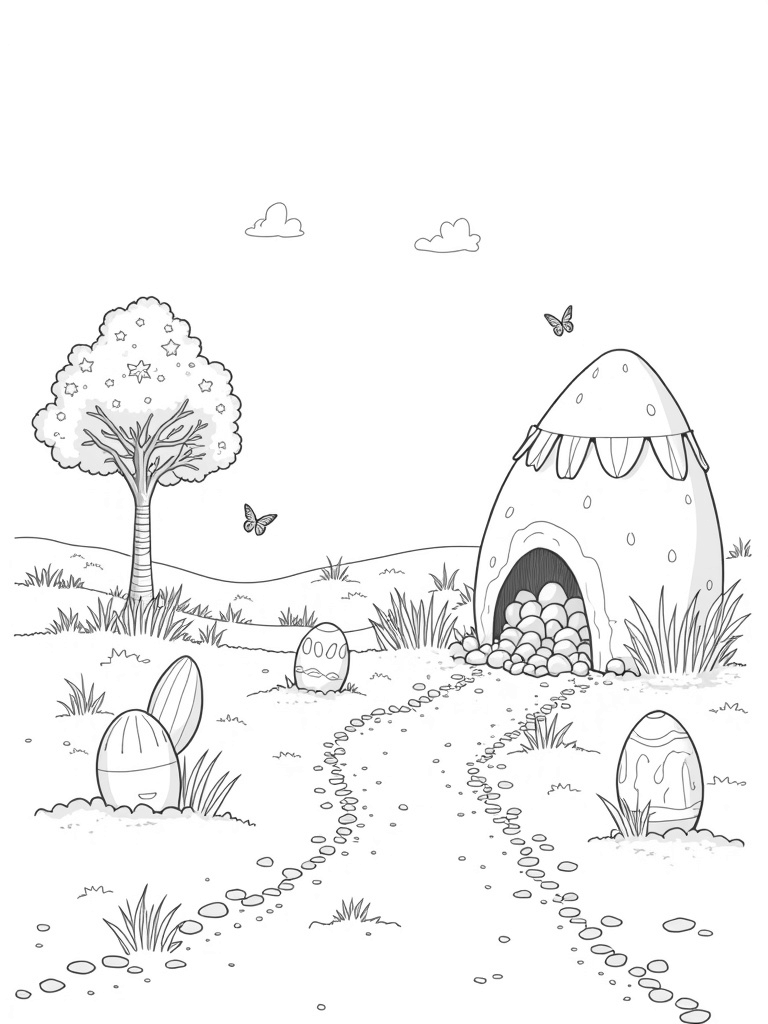 Imagine a garden where flowers are actually gigantic, colorful eggs peeking out of the ground! A winding path made of soft pastel pebbles leads you to a cozy, hollow egg that looks like a little burrow. You can almost hear the butterflies fluttering around, and they seem to dance in the air above tufts of grass. Not too far away, there’s a towering tree shaped like a carrot, its branches decorated with bright ribbons swaying gently. How fun would it be to color all these delightful details?