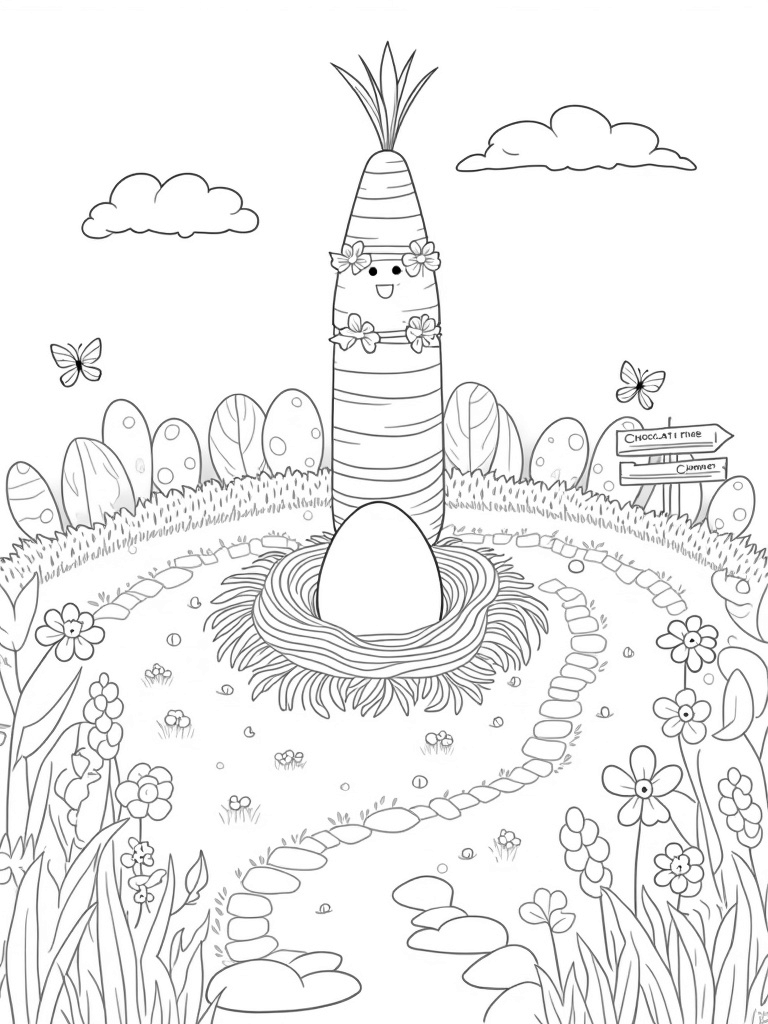 Look up, and you'll see a friendly carrot-shaped tower that spirals high into the sky. It’s decorated with cheerful ribbons and tiny butterflies that dance all around it. This tower is not only fun to color, but it also adds a playful twist to the whole scene!