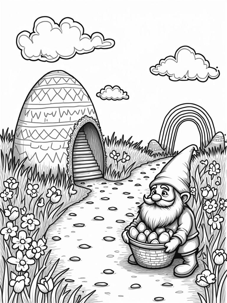 Gnome's Meadow of Colorful Eggs and Bunny Clouds Coloring Page