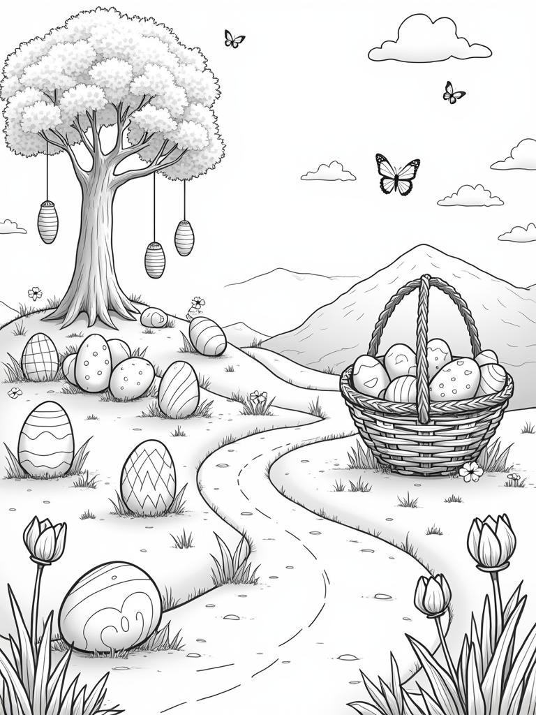 As you color, keep an eye out for vibrant butterflies dancing above the scene. They add an extra sprinkle of magic! And don’t miss the large basket spilling over with pastel-colored eggs, each one featuring its own unique patterns. It’s a treasure trove of creativity just waiting for your artistic touch.