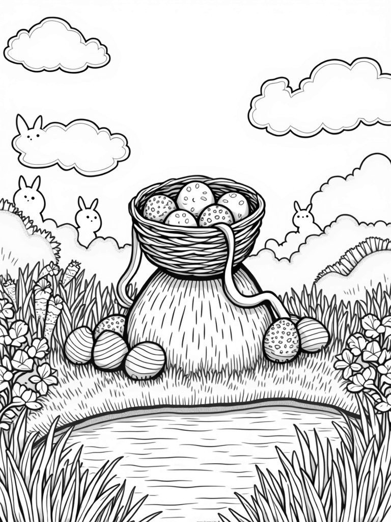 In the background, a tranquil pond reflects the pastel sky, dotted with fluffy clouds that look just like bunnies! Nearby, a patch of vibrant carrots stands tall, each wrapped in shiny, colorful foil that sparkles in the sunlight. It’s the perfect place for little imaginations to run wild as they fill in the colors and bring this scene to life.