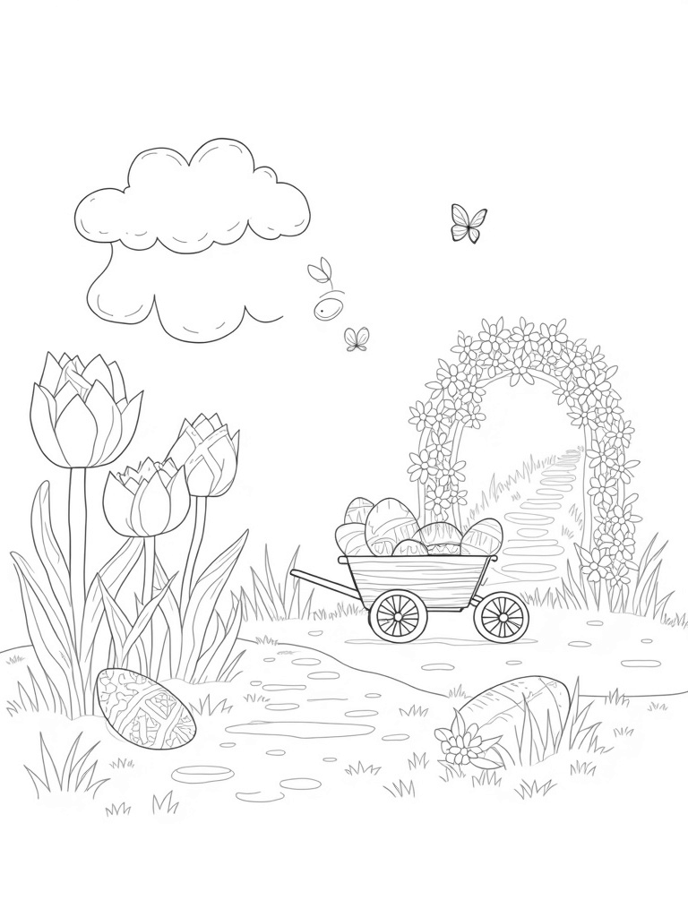 The center of the garden features a wooden wheelbarrow overflowing with colorful egg-shaped baskets. It’s surrounded by butterflies fluttering about, adding to the cheerful vibe. If you follow the winding pebble path, it leads you to a whimsical archway made of intertwined vines and bright blooms. This is a perfect spot for kids to let their imaginations run wild while coloring!