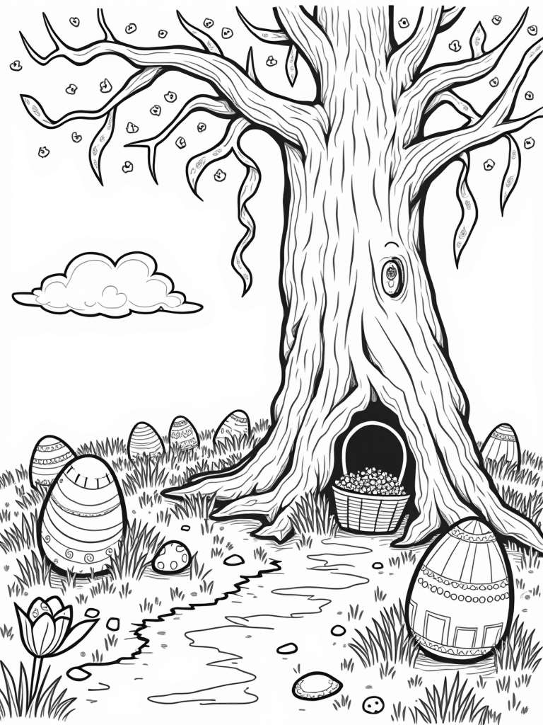 This scene is bursting with fun! You’ll find a magical garden filled with oversized Easter eggs, each one decorated with delightful patterns of swirls and flowers. A winding path made of pastel pebbles leads the way to a giant tree trunk that’s been hollowed out, where colorful ribbons hang down like playful vines. Nestled among the roots, vibrant tulips surround a beautifully ornate basket overflowing with shimmering, jewel-toned eggs.