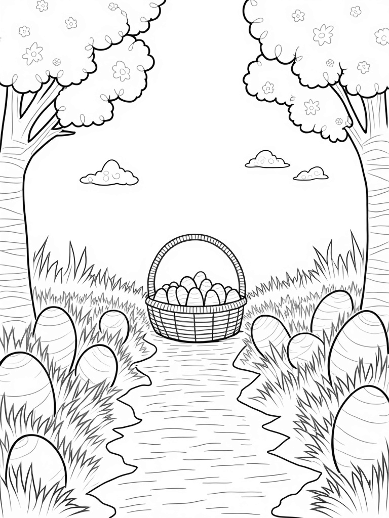 Get ready to color this free, printable coloring page featuring a whimsical garden with oversized eggs, carrot trees, and bunny-shaped clouds. Perfect for Easter fun, this design will spark creativity in kids of all ages!