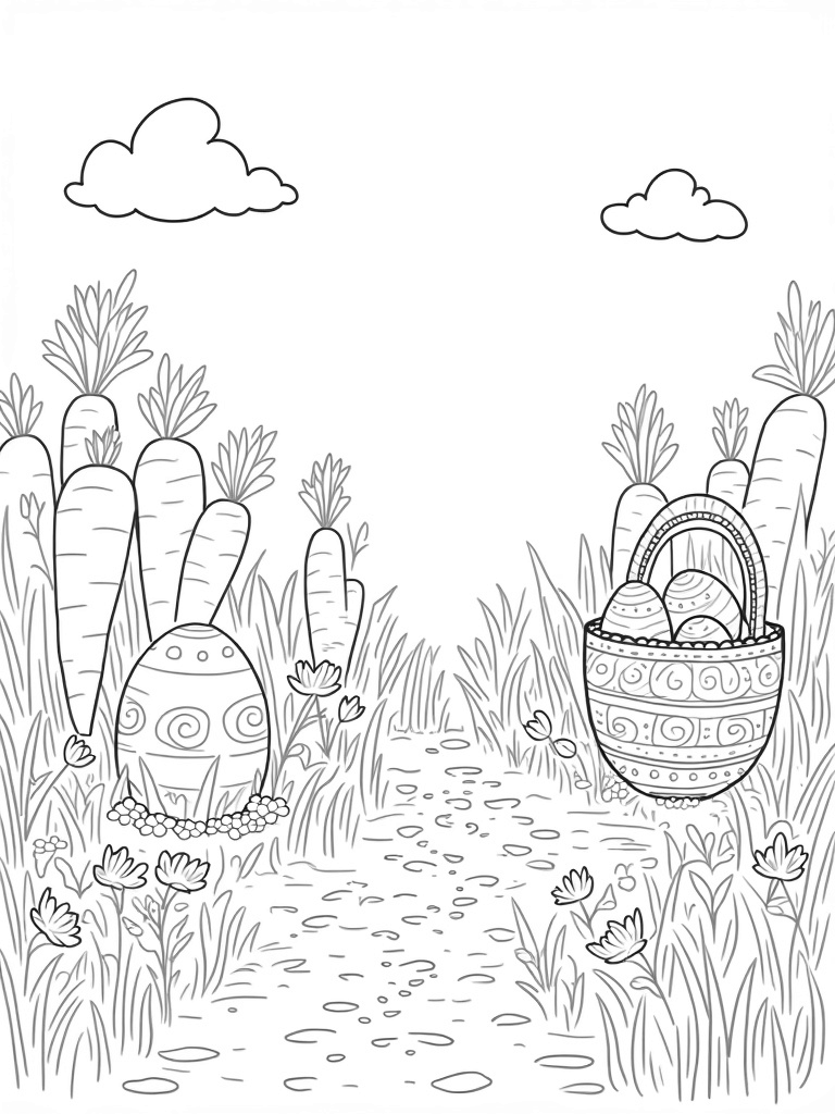 This scene is all about a vibrant garden filled with giant, decorated eggs hiding among the flowers. Picture carrots that are so tall, they look like trees! In the middle, there's a big, fancy basket overflowing with colorful pastel eggs, each with its own unique pattern. It’s a feast for the eyes and a delight for anyone who loves to color!