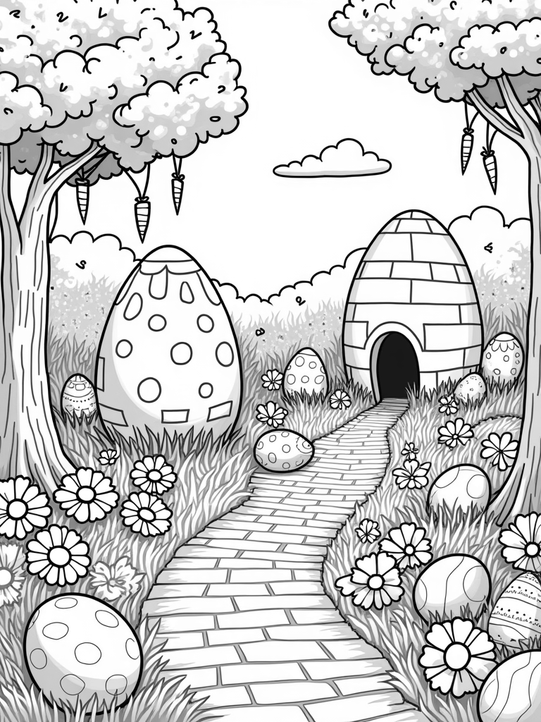 Check out this free, printable coloring page featuring a whimsical garden filled with oversized eggs and vibrant flowers. Perfect for Easter bunny fans, this fun scene is sure to spark creativity in kids of all ages!