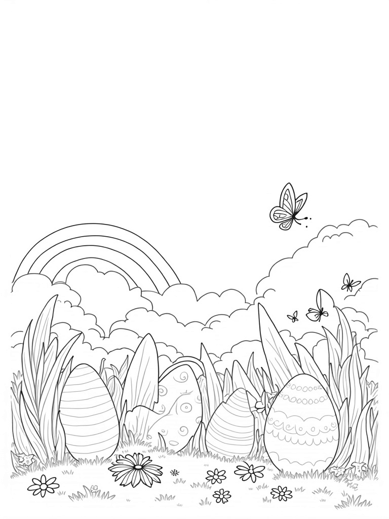 Look closely and you’ll see fluffy clouds shaped like bunnies drifting lazily in the sky. A rainbow arches playfully over the entire scene, bringing even more color to your masterpiece. The daisy clusters at the base of the eggs add a touch of fun, making this garden feel extra special. It’s a perfect coloring page for kids who love to let their imagination run wild!