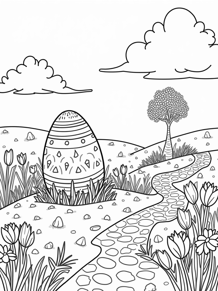 Imagine a garden where everything is a bit bigger and a lot more colorful! In the center, there’s a magnificent egg on a pedestal, covered in beautiful floral patterns and fun geometric shapes. Scattered around are giant pastel-colored eggs that just beg to be colored in. Vibrant tulips and cheerful daisies are blooming, their petals reaching out like little rays of sunshine, adding to the garden's charm.