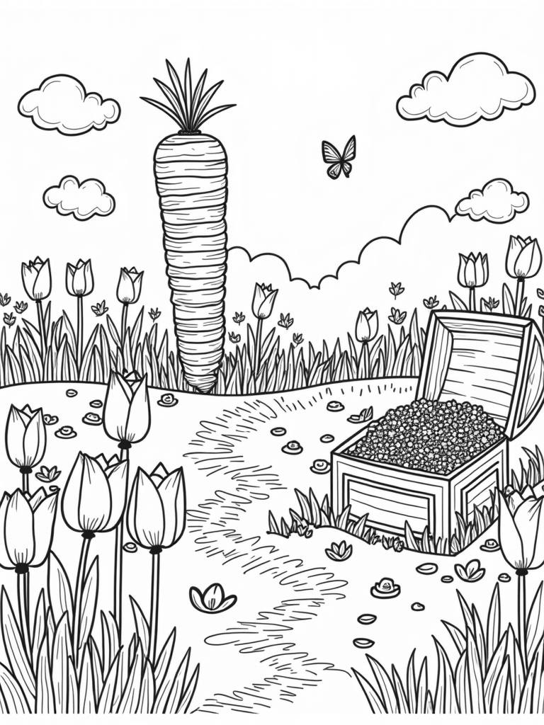 Pastel Egg Meadow with Carrot Tower and Candy Chest Coloring Page