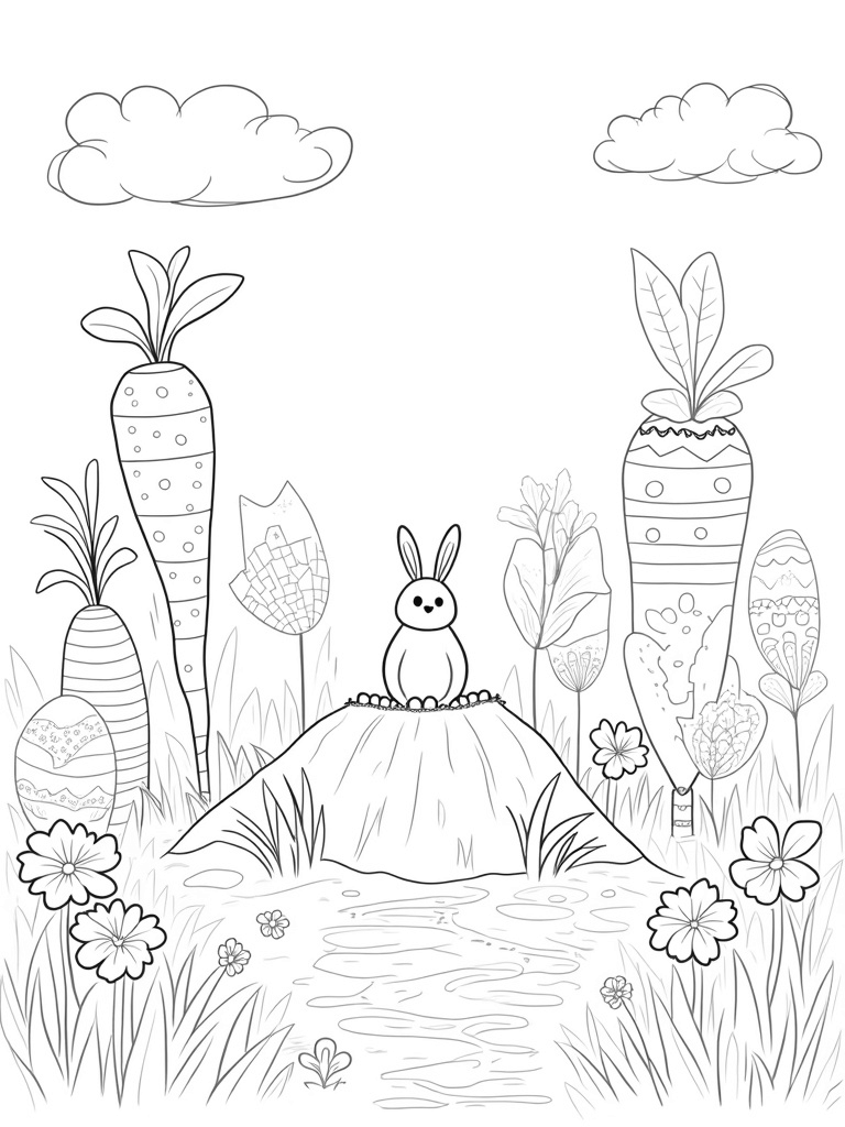 Imagine a garden bursting with color! Here, you'll see oversized Easter eggs, each decorated in fun and funky patterns, nestled among vibrant flowers that seem to dance in the breeze. At the heart of the scene, a large patchwork bunny sits proudly on a grassy mound, surrounded by swirling designs that make you want to grab your crayons and start coloring right away.