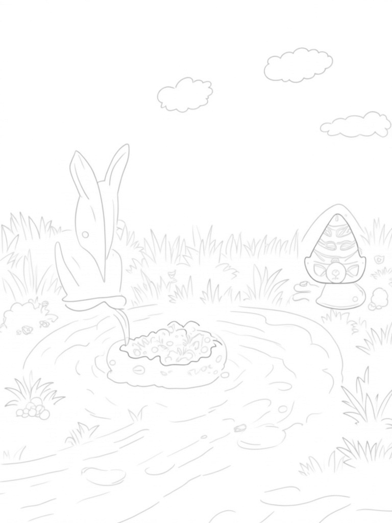 This coloring page is all about letting your imagination run wild. You can choose any colors you like for the eggs and the fountain! Whether you prefer bright and bold colors or soft pastels, it's totally up to you. Plus, the fluffy clouds shaped like bunny ears drifting overhead add a fun touch that you can color however you like. Grab your crayons and make this whimsical garden come to life!