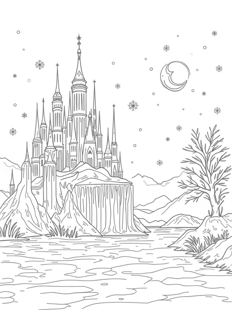 Don't forget to pay attention to the beautiful icicles hanging from the edges of the palace. They’re just waiting for your favorite colors to make them shine! Next to the palace, a whimsical tree stands tall, its branches covered in shimmering frost, inviting you to add some color to its frosted limbs. Grab your crayons or markers and let your imagination run wild!