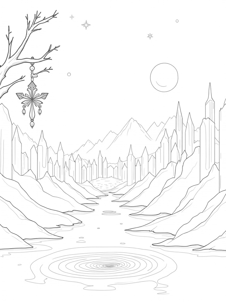 This coloring page showcases a stunning frozen landscape, where crystalline ice formations tower like majestic castles under a soft moonlight. In the foreground, you'll see a delicate snowflake chandelier hanging from a frosty tree branch, sparkling beautifully. Take a closer look at the nearby frozen pond, where swirling ice spirals create mesmerizing patterns on the surface, just waiting for your favorite colors.