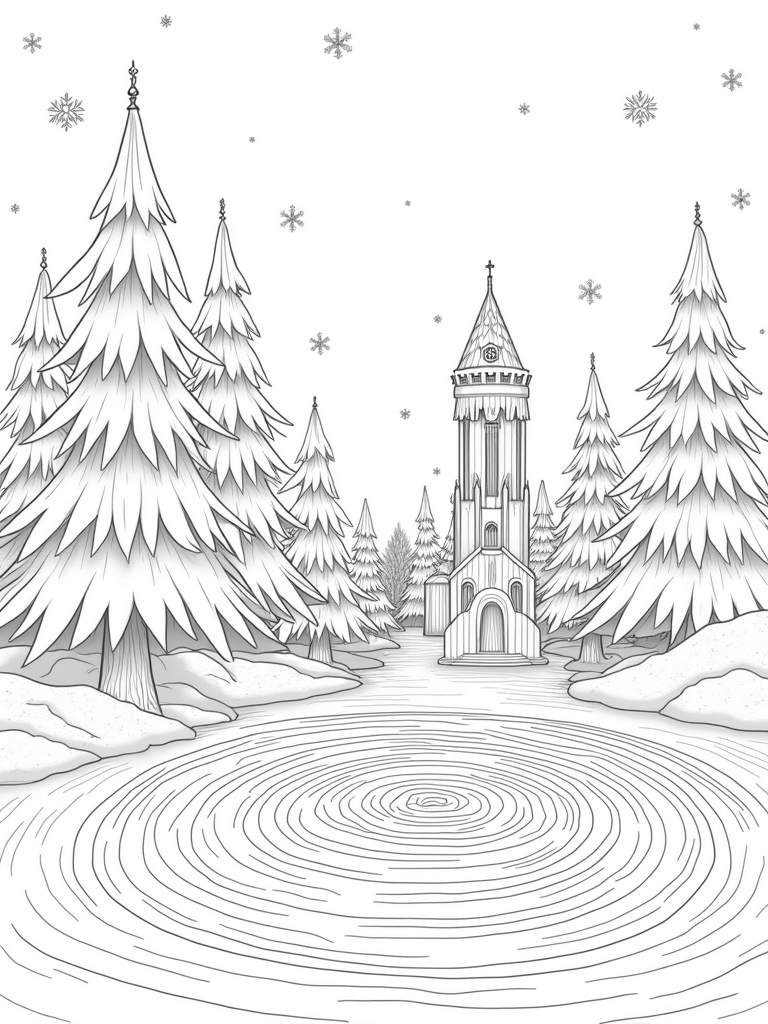Frozen Forest with Ice Castle and Snowflake Whirlpool Coloring Page