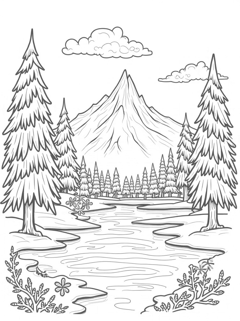 A gentle wind swirls around, creating playful icy spirals in the snow. In the background, a majestic mountain rises high, its peak glistening with a layer of frost. Above it all, fluffy clouds twist into interesting shapes, casting playful shadows across the scene. It’s the perfect place for kids to let their imagination run wild as they add their favorite colors!