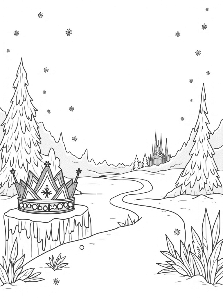 Frozen Forest with Ice Crystals and a Snowflake Crown Coloring Page