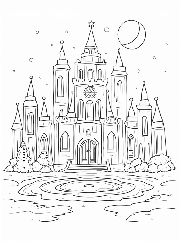 Frozen Ice Palace with Snowmen and Snowflakes Coloring Page