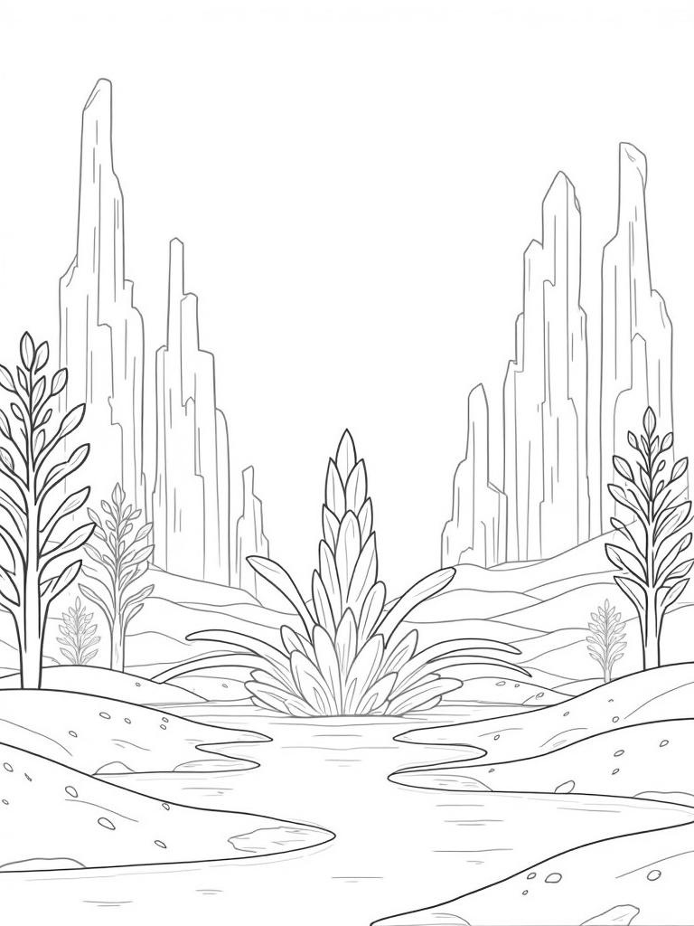 Frozen Landscape with Ice Crystals and Snowflake Fountain Coloring Page