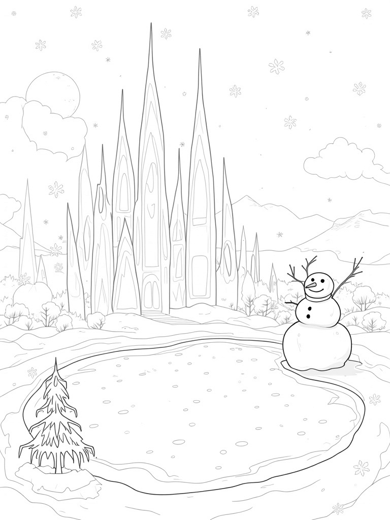 Frozen Landscape with Ice Sculptures and a Snowman Coloring Page