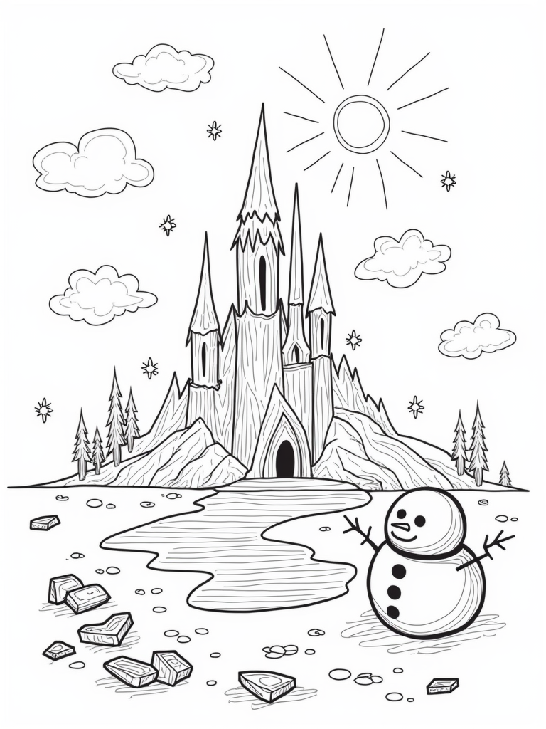 This coloring page shows a magical ice castle with sparkling towers that look like they’re made from crystals, all set against a snowy landscape. Right beside it, there’s a cheerful snowman sporting a bright orange carrot nose, ready to add some fun to your colorful creation. Nearby, a frozen pond reflects the playful swirls of snowflakes floating above, making it a perfect spot for some winter wonder.