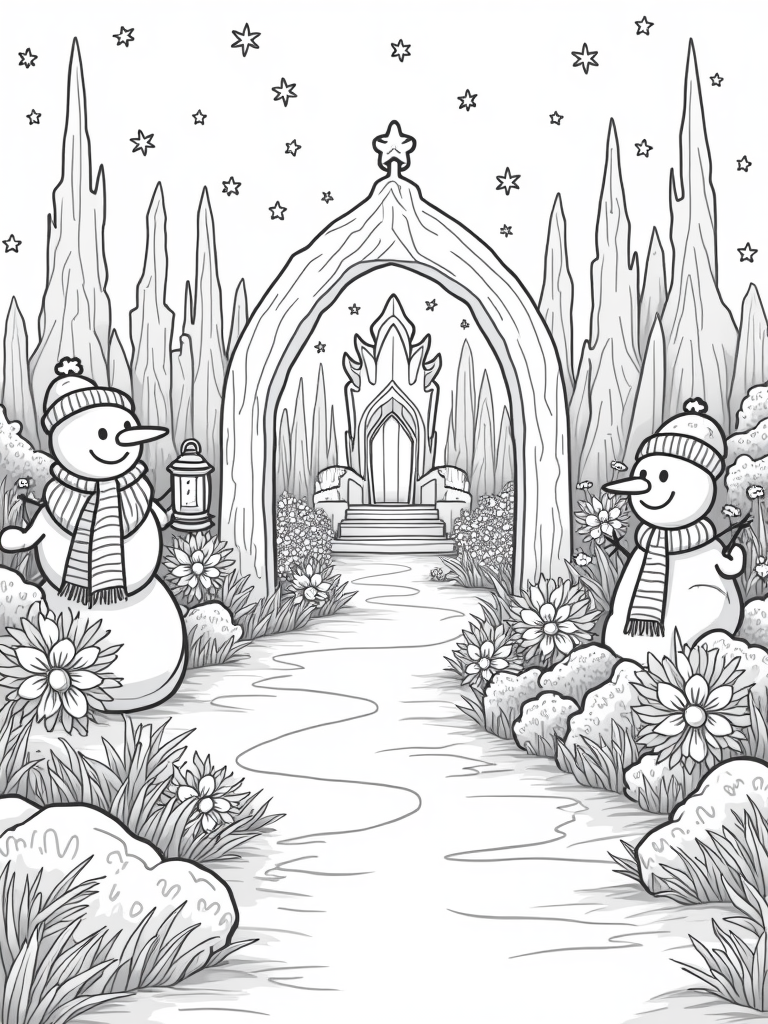 As you color, picture the soft, fluffy snow forming a winding path leading to a glowing lantern that lights up the whole scene. The gentle glow adds a cheerful warmth, making the ice garden feel inviting even in the chilly winter air. Delicate snowflakes drift all around, just waiting to be colored in.