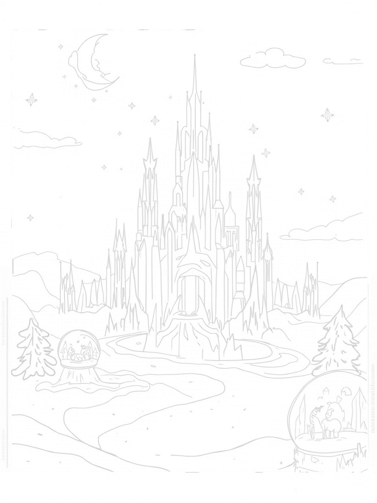 To the side of the palace, a winding path of frosty glitter leads to a giant snow globe. Inside, there’s a tiny winter forest just waiting for your colors to bring it to life! Above it all, the sky is a swirl of frost with twinkling stars and a crescent moon, giving the whole scene a peaceful glow.