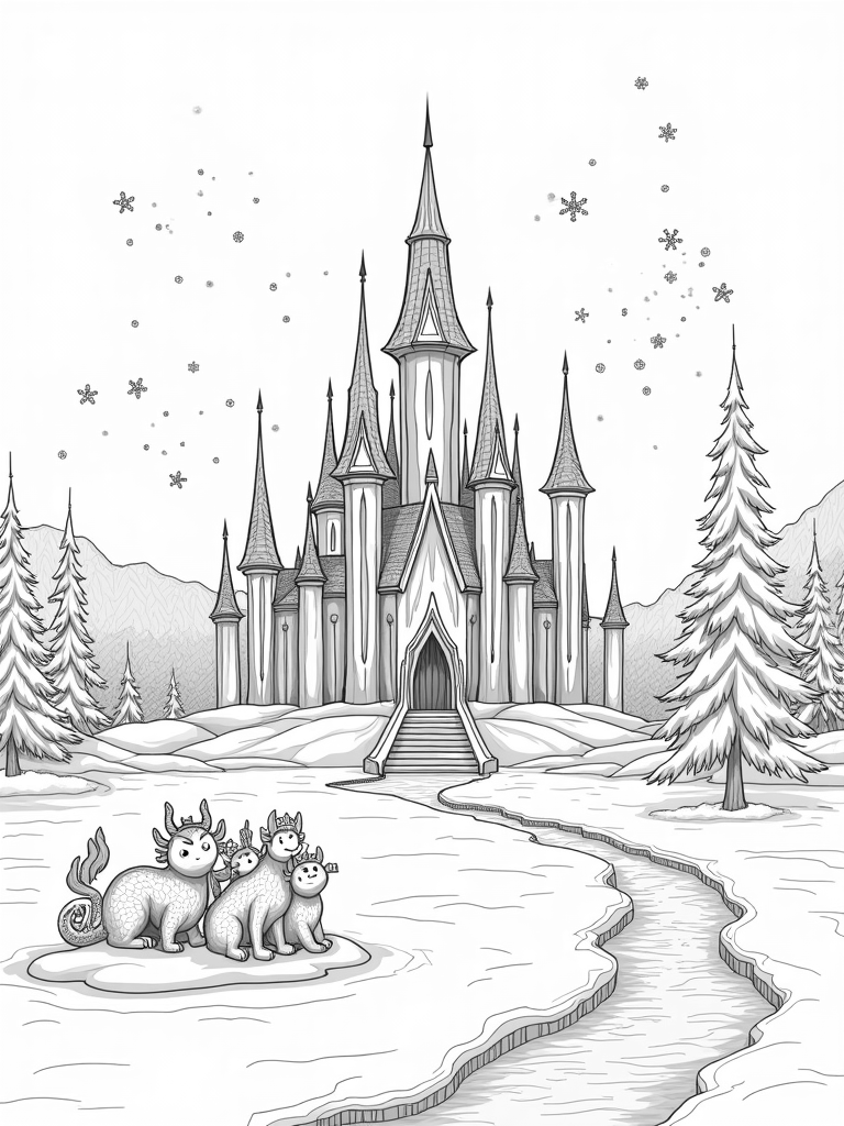 Magical Ice Palace and Mythical Creatures Coloring Page